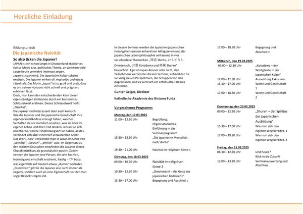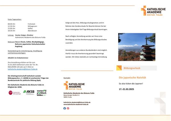 Ihre Anmeldung erbitten wir bis zum 31.01.2025 telefonisch unter der Tel.-Nr. 0661 8398-120 oder per E-Mail an katholische.akademie@bistum-fulda.de