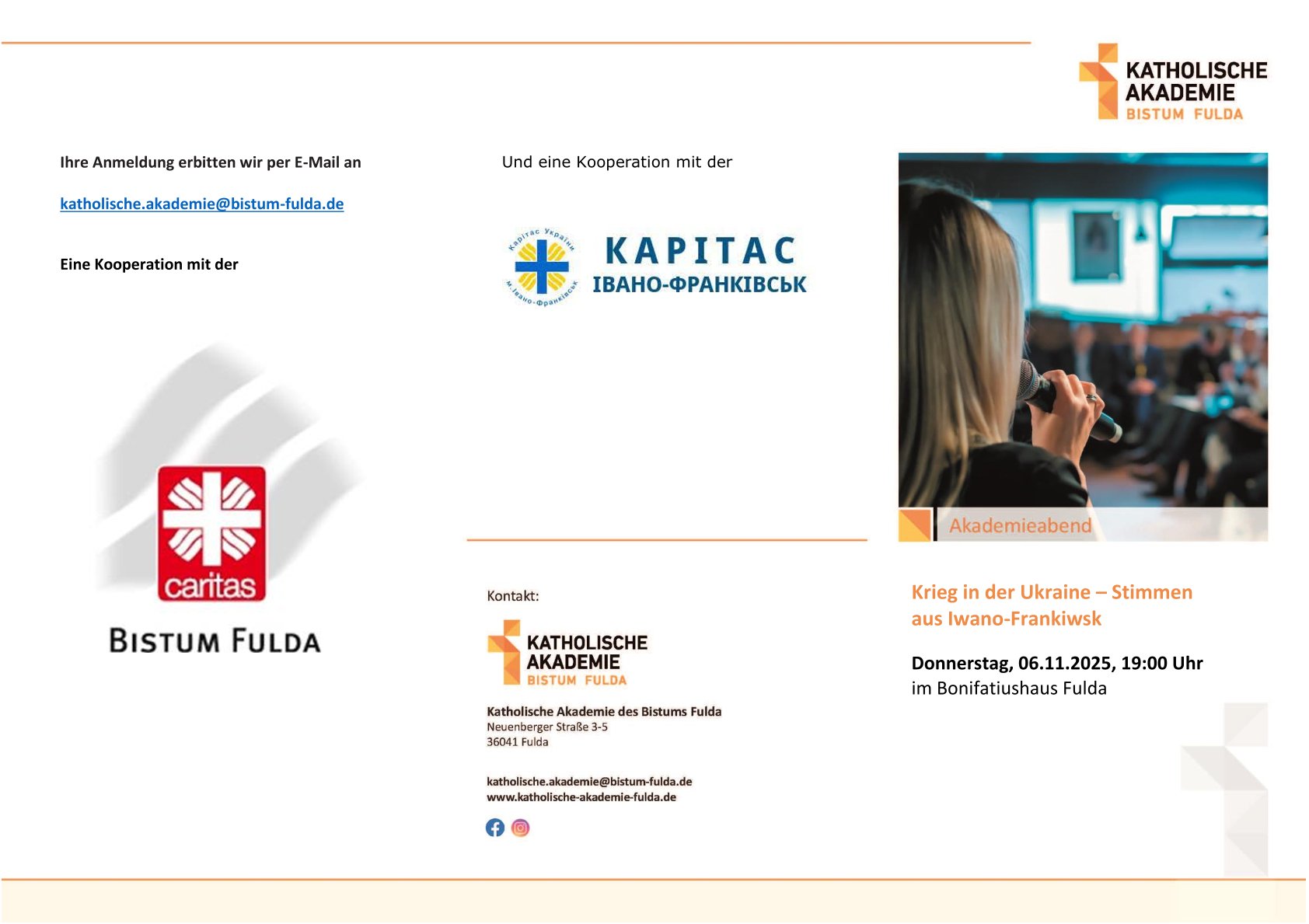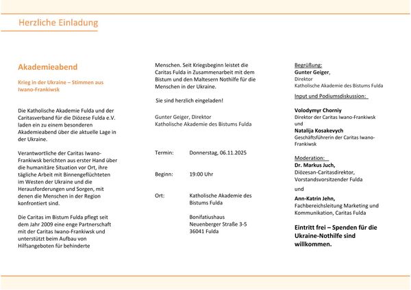 Die Katholische Akademie Fulda und der Caritasverband für die Diözese Fulda e.V. laden ein zu einem besonderen Akademieabend über die aktuelle Lage in der Ukraine. Verantwortliche der Caritas Iwano-Frankiwsk berichten aus erster Hand über die humanitäre Situation vor Ort, ihre tägliche Arbeit mit Binnengeflüchteten im Westen der Ukraine und die Herausforderungen und Sorgen, mit denen die Menschen in der Region konfrontiert sind. Die Caritas im Bistum Fulda pflegt seit dem Jahr 2009 eine enge Partnerschaft mit der Caritas Iwano-Frankiwsk und unterstützt beim Aufbau von Hilfsangeboten für behinderte Menschen. Seit Kriegsbeginn leistet die Caritas Fulda in Zusammenarbeit mit dem Bistum und den Maltesern Nothilfe für die Menschen in der Ukraine.