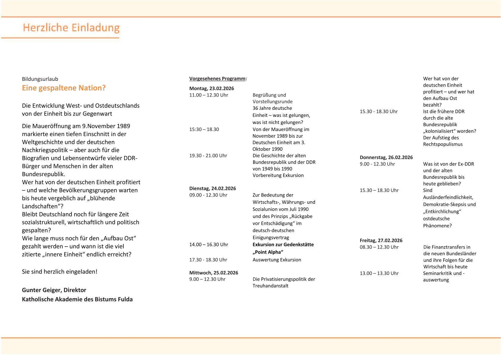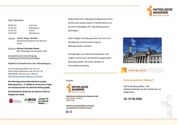 Ihre Anmeldung erbitten wir bis zum 09.01.2026 telefonisch unter der Tel.-Nr. 0661 8398-120 oder per E-Mail an katholische.akademie@bistum-fulda.de
